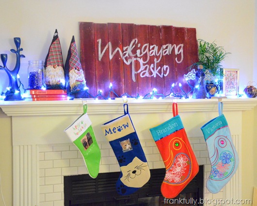 I’ve got a very multicultural mantel (well, at least two cultures). :) Next to my Maligayang Pasko sign are two Swedish Santas that I embroidered and sewed together a few years ago.